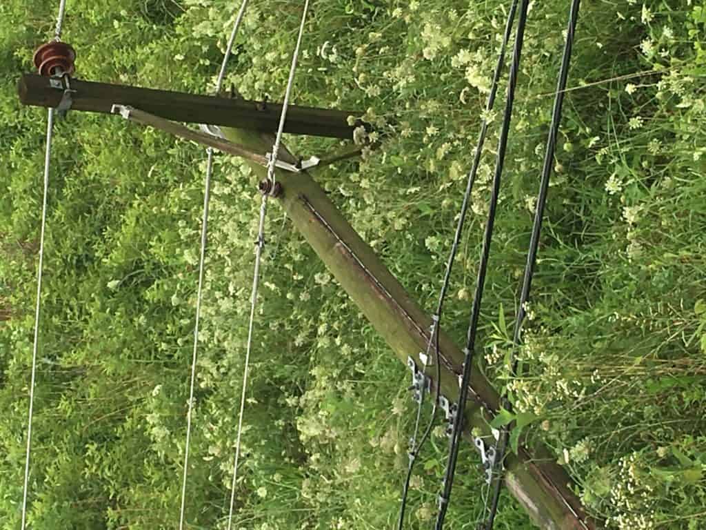 This photo was taken along Hurt Road in Chapel Hill. A pole was broken beneath the cross arms after a fallen tree weighted down the line and caused the pole to snap.